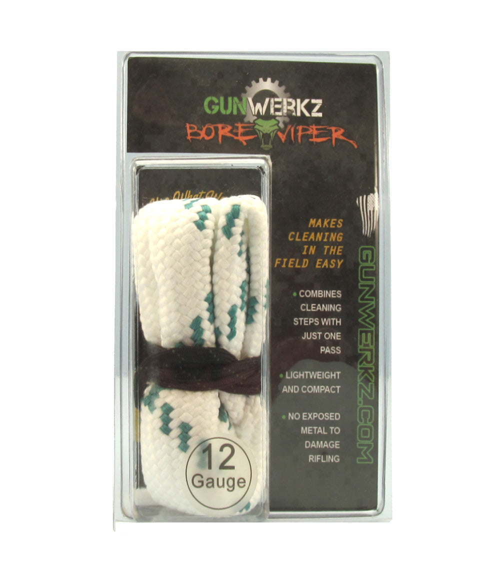 Scrubs and cleans in a single step. First, apply Gun Cleaner to the front of the cord, drop the cord into the bore and pull through one or two times. Then apply Ultra Gun Oil to the end and pull through one more time. This last step applies a thin film of oil down the barrel to protect the finish. The built in, bench-quality phosphor bronze brush and braided floss scrub, clean and oil the bore in just minutes. Washable and reusable; lightweight design wraps up neatly for easy storage and carry. - The Bore Viper 12 Gauge may be tight fitting when new. If it is difficult to pull through bore, it may be easier to step on the brass "sniglet" end of the pull cord with your foot while pulling up on the firearm.