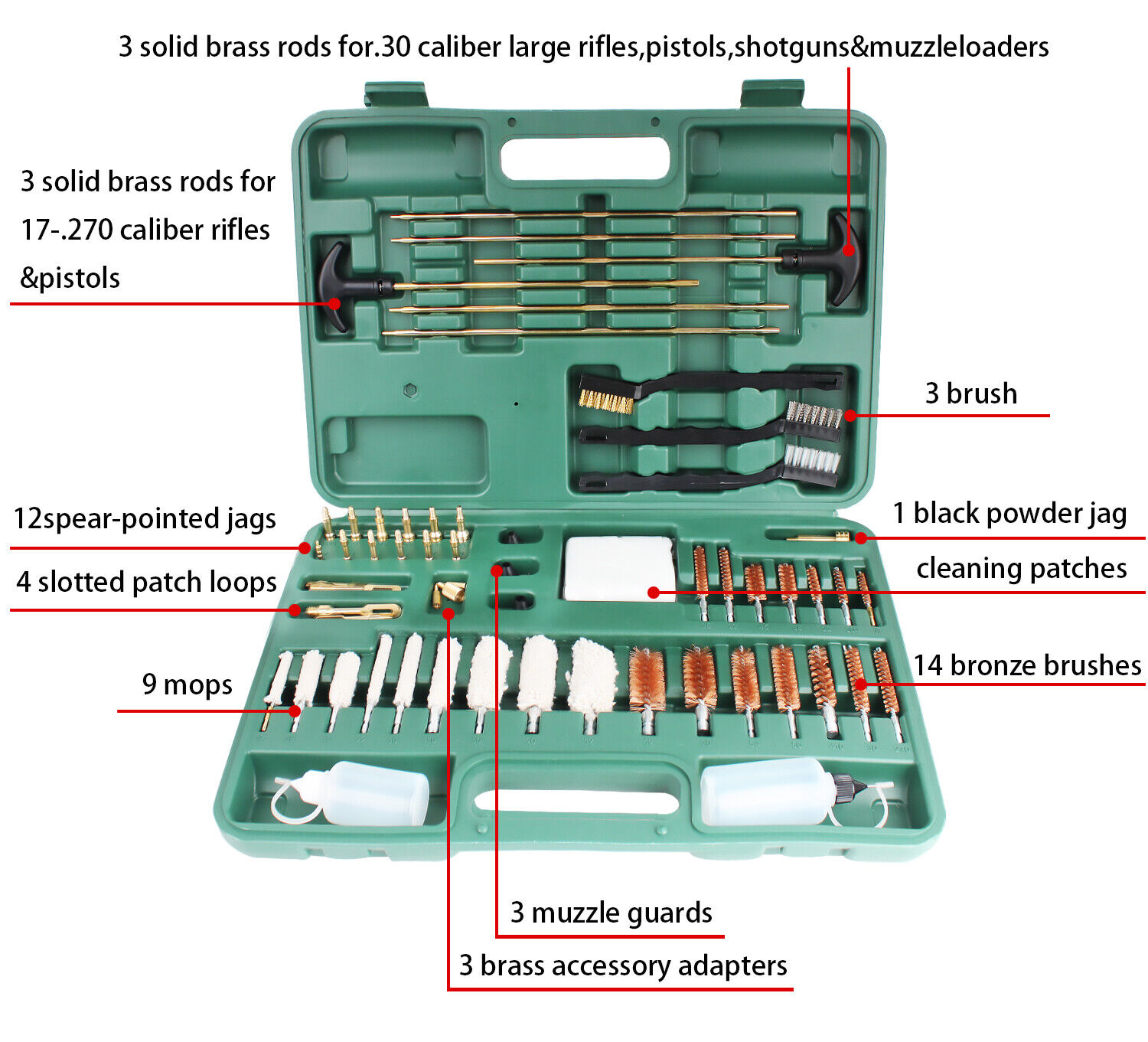 Gun cleaning kit for all guns: This universal gun cleaning kit suitable for all types rifles, shotguns and pistols cleaning. This cleaning kit provides all the supplies you needed to keep your guns in perfect condition!